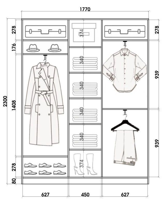 Модель 3-х дверного шкафа (полки в центре)